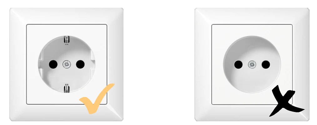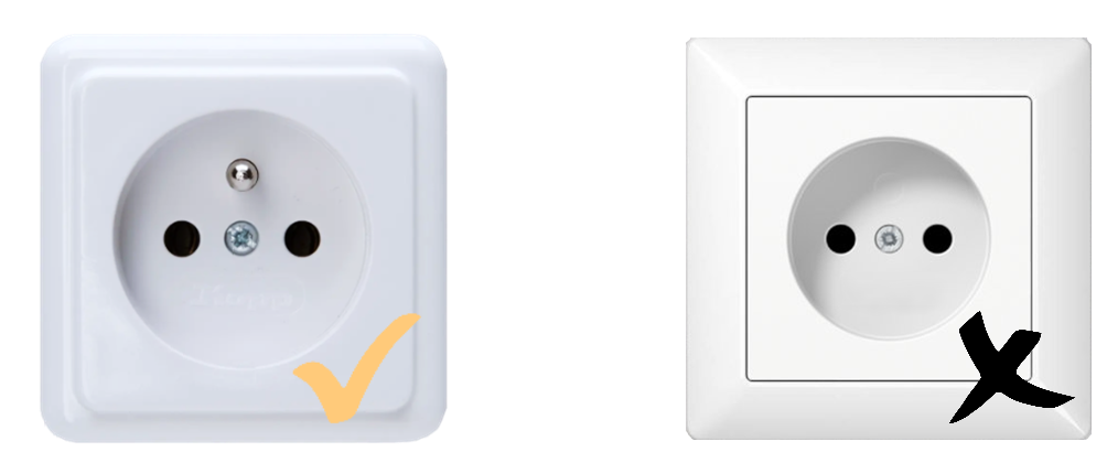 Eine geerdete Steckdose hat neben den zwei Löchern auch Metallstifte an der Ober- und Unterseite. Eine nicht geerdete Steckdose hat nur zwei Löcher. Siehe unten ein Bild einer geerdeten und einer nicht geerdeten Steckdose.